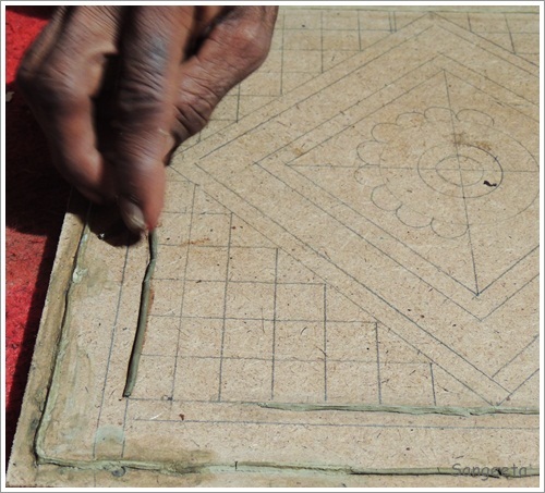 Earlier done only on mud walls of homes to act as an insulator in extreme climatic conditions, it now finds its pride of place in modern homes in the form of wall décor. Plywood has now replaced the earlier dried camel dung base (pungent smell) for decorative pieces. The design is drawn on a piece of plywood with pencil. Clay is mixed with water to make it soft and pliable and then rolled into long pieces and stuck on to the design with a mild adhesive.