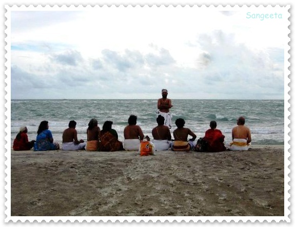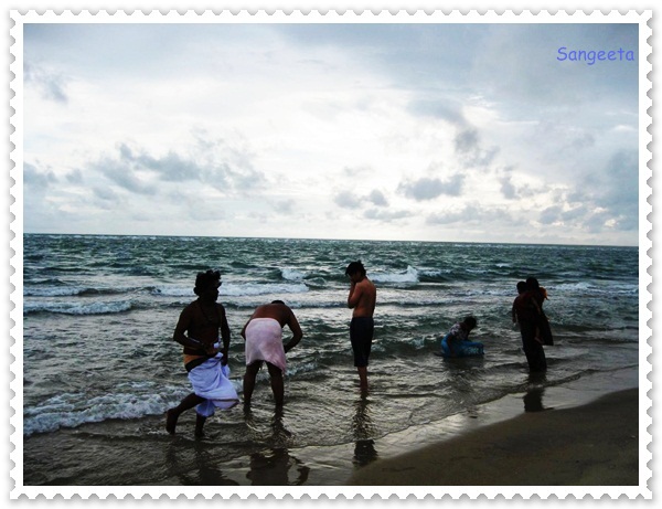 A little ahead on the sea shore, I noticed some people drawing a bow on the sand and then scooping it to make an offering to the divine in the confluence of Indian Ocean and Bay of Bengal.