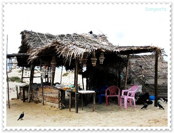 I was out of my stupor at the sound of a shrill cry and hurried footsteps. A few children belonging to the fishermen families occupying the makeshift thatched huts near by were running in excitement with the peacocks. The birds made a royal entry adding colour to a near black and white surrounding.