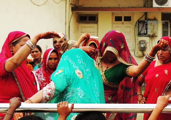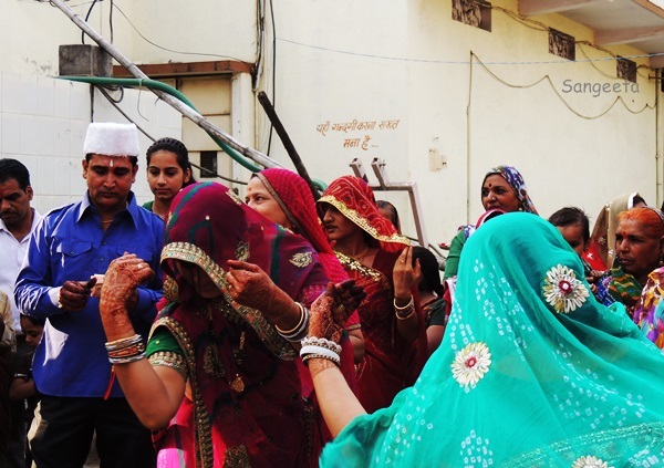 During a recent visit to Indore in India, one evening we walked into the 9th century Annapurna Devi Temple. The goddess here symbolizes food, blessing devotees to be always abundant with food at home. We were greeted with peppy drum beats in front of the main shrine. A group of saree clad women across different age groups were surrounding a hesitant man in a blue shirt brandishing a small sword rather shyly. On closer look, his henna decorated hands and feet gave way that he was the groom, accompanied by all the women in his family, seeking blessings from the mother goddess for a happy life ahead. Within minutes, 2 young married, beautiful ladies, covered their faces with the edge of their saree and danced with gay abandon at the beat of the drum. The fleeting expressions on their faces beyond the veil gave away the joy that they experienced as they swung their arms showing off their beautiful henna lined palms, bending their bodies and slightly swinging the hips as they twirled around but an image of grace and beauty in totality. Soon they were joined by an older woman who danced away with a child on her shoulder fearlessly and gracefully without losing balance for a second.