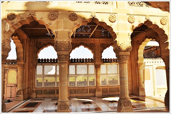 The imposing red sand stone palace is located in the middle of a huge garden which stretches until the Arabian sea. The ground floor has an array of rooms and a well lit sit out at the back characterized by beautifully carved stone meshes (jalis).