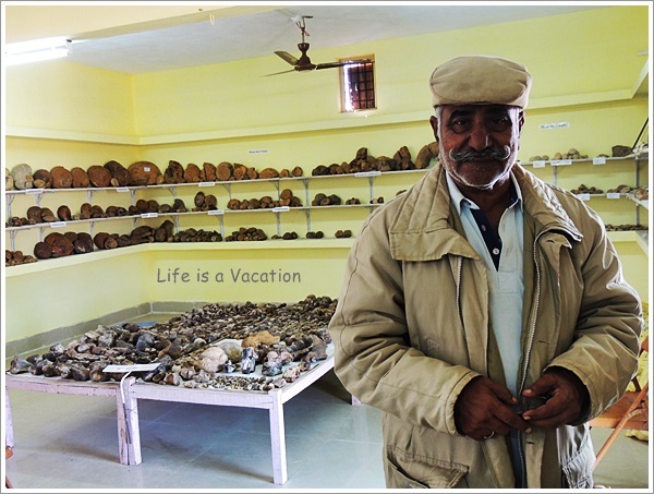 Mohansinh Sodha crossed over to India from Pakistan during the 1971 war as a temporary recruit and offered his services. He lived in this Kutch region and was like any other young man until he chanced upon a fossil called Ammonite which changed the course of his life and thinking. He has been collecting different kinds of fossils since then ranging from plants, fruits, gem stones, animals, reptiles which are on display in a modest 2 room show case area. This place was set up in 2002 with his own funds, some assistance from well wishers and minimal aid from the government. Recently, he found a collection of fossils which were reconstructed and identified as a sea cow along with the research team of Roorkee Institute of Technology. This species has now been officially named Dommingia Sodhae in his honour.