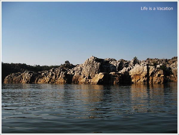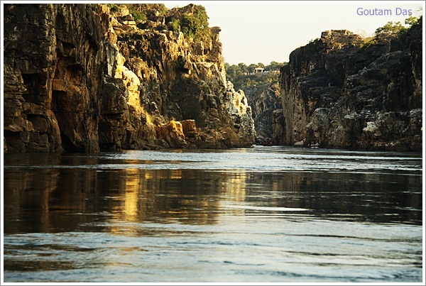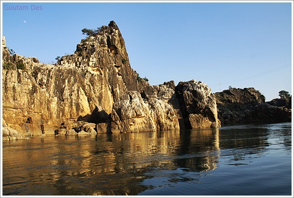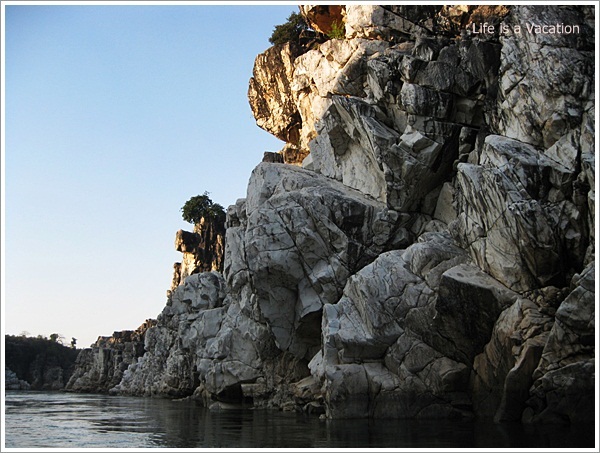 A trip to the Bhedaghat area of Jabalpur is incomplete without a boat ride on the Narmada through the high cliffs or the marble rocks. It is a rather rickety boat ride with a group of 10-12 people on the quiet Narmada through the 3km long gorge that runs between the high cliffs (approx 100 feet). As the boat moves, the white cliffs streaked with green and brown volcanic rocks shimmer under the sun light. The boat man narrates a story of love in a comic style accompanied by some off tune latest remix which generates amusement and laughter. At some point during the ride, the Bandar Kodini point can be seen where the cliffs come so close that monkeys are able to jump across. I did not notice a monkey but a young boy of 10-12 who dived down into the water from a cliff top all for a 10 Rupee which he wanted in exchange of his carefree dare devil act.