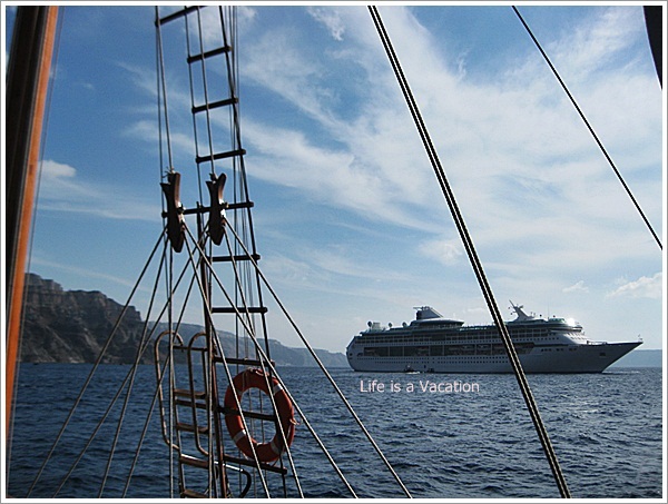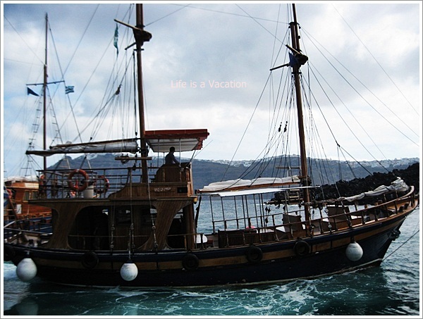 My friend and I took a trip from Fira in Santorini to a Volcanic Island (Nea Kameni) in a ship which resembled the ones that are seen with the Pirates of the Caribbean. We braved the high tide and an occasional storm which drenched us completely. Every moment aboard was magical, the enchanting blue, simmering sunlight on the low mountain ranges around and the undulating waves that thrashed against the ship. We swayed from left to right and right to left but regained balance soon after, just like life.