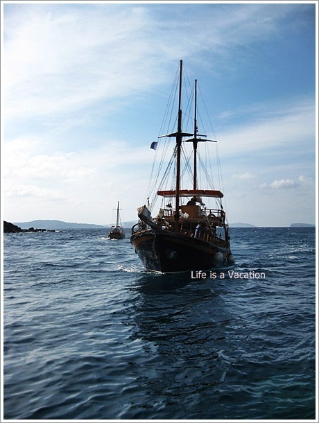 In Greece, you will move island to island in a ferry and some side trips on a ship like this. The ferry is pretty cool, you dont feel a thing but in a ship, he may feel nauseous since it sways a lot.