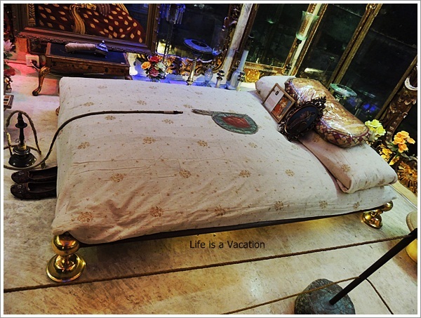 The building is partially destroyed and the run down staircase led us into a hall through a small passage where the glass fitted and gold plated cannon and palanquin on display have definitely seen better days. The Hall better known as Fuvanra Mahal appeared to be the entertainment room and the musical instruments were organized all around with a marble throne in the centre, presumably for the king. The musicians would take seat on the square divan decorated with an embroidered cover. The lamps all around would be filled with water and a layer of oil that would light up the room while the vibrato and tremolo of the stringed instruments entertained the audience. The walls are complete with exquisitely carved gold plated and ivory doors interspersed with glass and mirrors. It was not shining as you would expect a palace of mirrors to be but yes some of the hanging chandeliers were testimony of the days of yore.