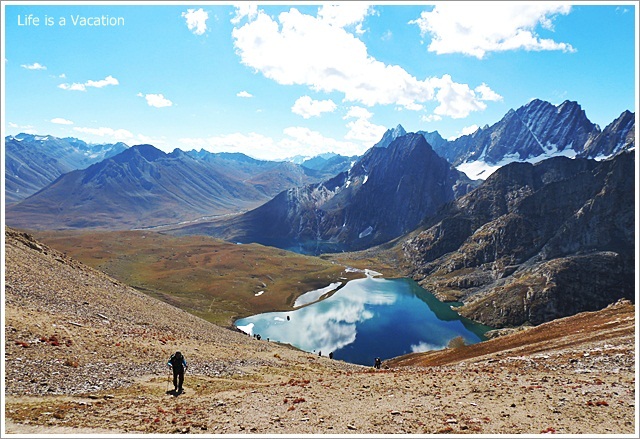 I kept taking a few steps ahead and looking back until the lakes quietly merged into the horizon. Sometimes in life we do the same, holding on to happy times oblivious of the future. Right or Wrong, I dont know !! I had considerably slowed down and had some catching up to do. The wind was blowing hard and clouds went astray but the sunshine on the mountain tops warmed my heart. I walked fast to the chants of “Om Mane Padme Hum” which instantly enabled me to center and focus like always. Between sips of water, a few stops to admire the untouched beauty of nature, we trekked through meadows and occasional rocky patches. We missed the blooming meadows but the occasional red, blue and yellow patch was proof enough of what would be in the month of July and August.