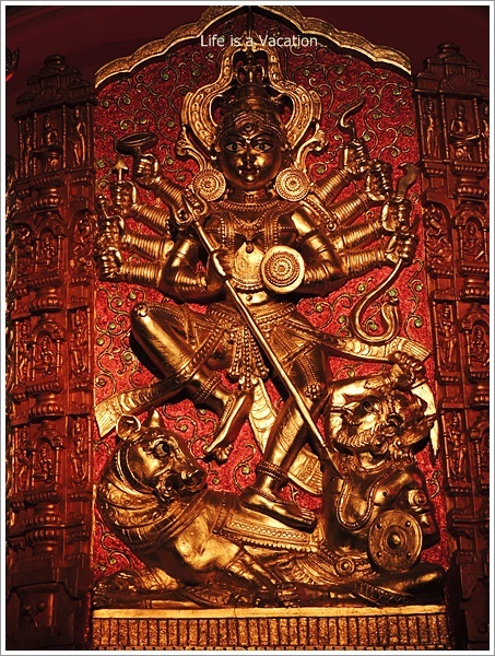 She is seen riding a lion which is symbolic of courage, royal grace and the ability to conquer difficult situations. She uses all the weapons to demolish demonic qualities symbolic of demon asura emerging from a buffalo representing dullness, lack of intelligence and ignorance