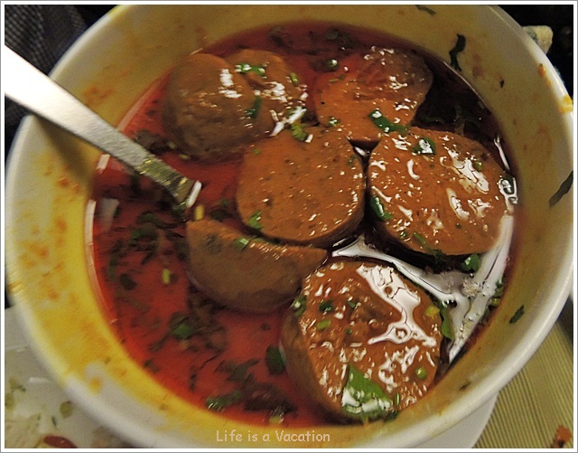 So far so good, but the prince (Gusthaba) and princess (Rista) were yet to arrive. Rista are small meat balls cooked in a fiery red gravy. I cut through the meat ball to check its softness and mind you, princesses need to be revered and not sliced the way I did :). The spice was befitting of a princess and swept me off with her beguiling charm, never shall I slice the Rista with such insensitivity, but slowly dig through it and devour every bit.