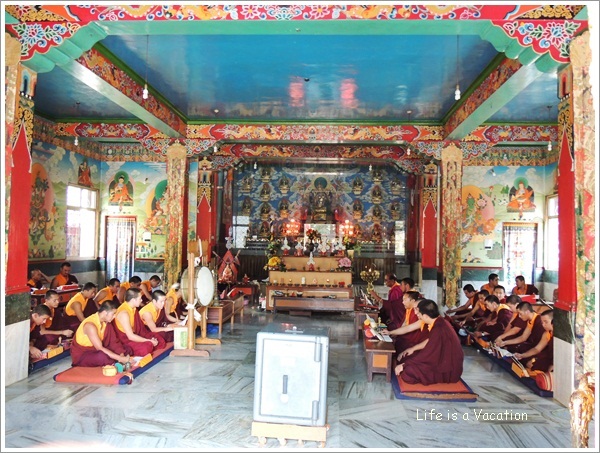 Rhythmic beats wafted through the air, as we were walking around. We followed the sound to land up in front of a hall where the young tibetan monks were in prayer. The rhythmic chanths in Tibetan was accompanied by beating of the drum and I sat there completely absorbed in the heavenly environment. After a while, one of the monks stepped out with the huge lamp and slowly the prayer session came to an end. Closer look at the young monks revealed gleaming calm faces as they emerged out of their session.