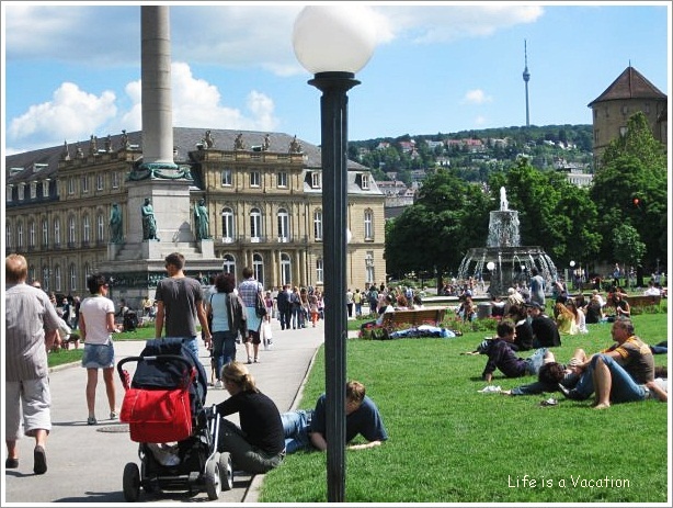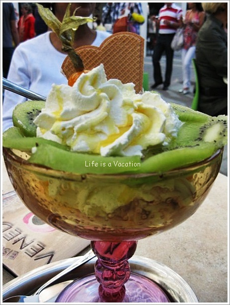 Stuttgart often acclaimed as the place where business meets the future and is “Das neue Herz Europas” (“The new heart of Europe”). While in Stuttgart, I had some time time to explore the busy town centre area, walking, observing, shopping and relishing the ambience. Schlossplatz is the largest square in Stuttgart bisected by Konigstrasse (King’s Street) from North to South. In the warm and hot summer months thats the place to hang around to make the most of the sun. After a short walk through the grounds, watching happy faces rolling on the grass and little feet zipping through on scooters, I was looking for shade (born and bred in a tropical country, I have been spoilt by the sun) and what better than to cool off with a giant sundae generously dosed with Kiwis and ice cream.