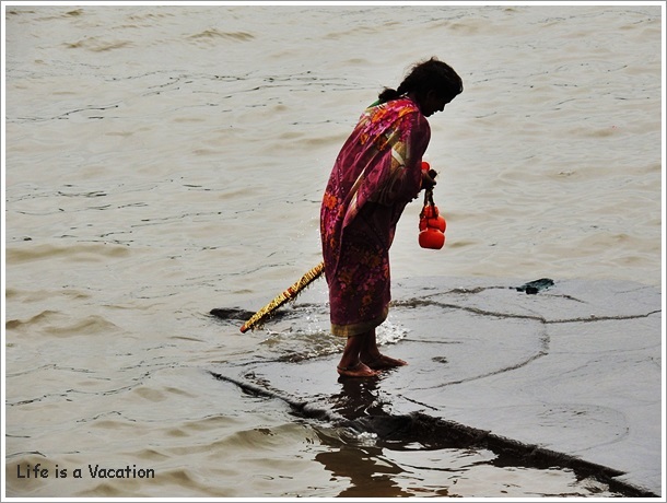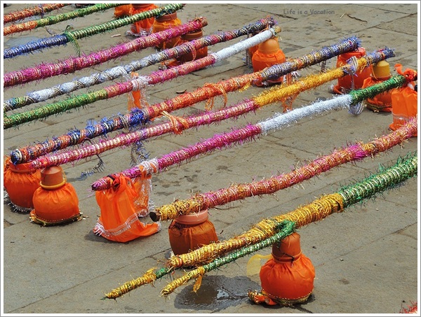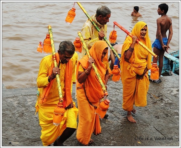 As groups of pilgrims arrived and departed, I munched on a deliciously soft corn cob wondering if this is just a pilgrimage to appease Shiva in the temple or is it an opportunity to attend to the Shiva who resides within us. One part of me said walking mindfully for a long distance with a pole hanging on one shoulder is about focus, being in the present and attaining balance in life and the other was taken in by the the infectious enthusiasm of the Yatris and yearned to take a dip.