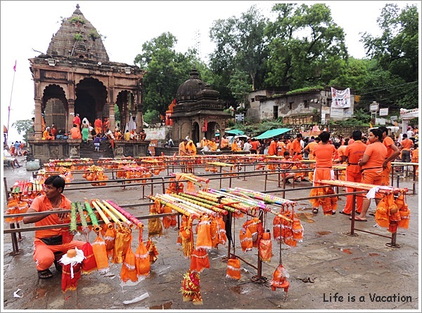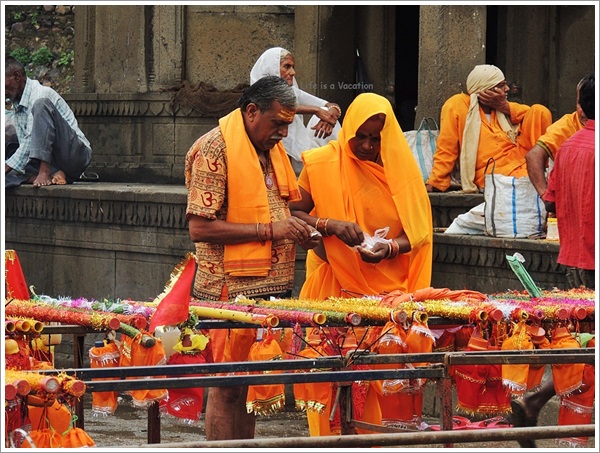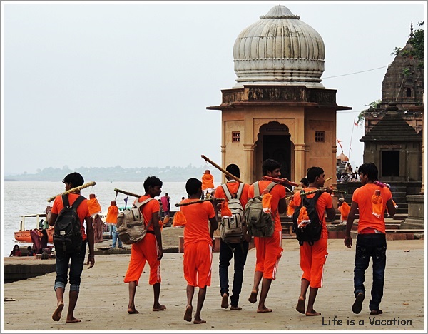 My journey along the Narmada introduced me to the shades of an unknown or rather a not so popular pilgrimage – Kavad Yatra. The road trip from Indore to Maheshwar via Omkareshwar on the relatively well maintained highway dotted with green presented itself with unexpected streaks of saffron that brightened up an otherwise cloudy day. Before your imagination runs wild, I am referring to people attired in saffron garb carrying a single pole on the shoulders with pots of water hanging on the two ends. While I peered at the young and old Kavad Yatris as they are popularly called walking with a measured sway to balance the pole, I was distracted and amused by the slow and rickety vans following them blaring peppy Bollywood tunes with altered lyrics ; replace Saajan or Piya with Shiva and you know what I mean.