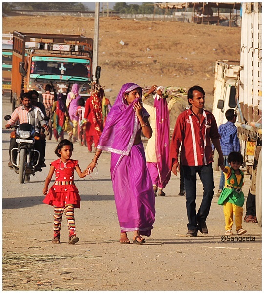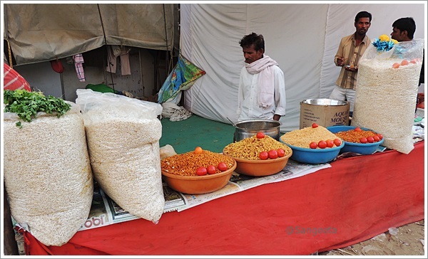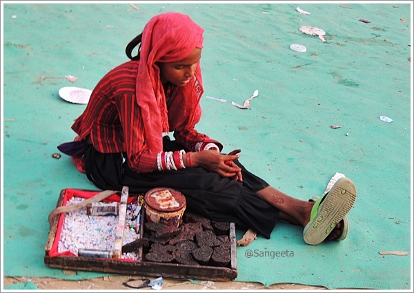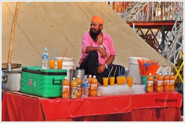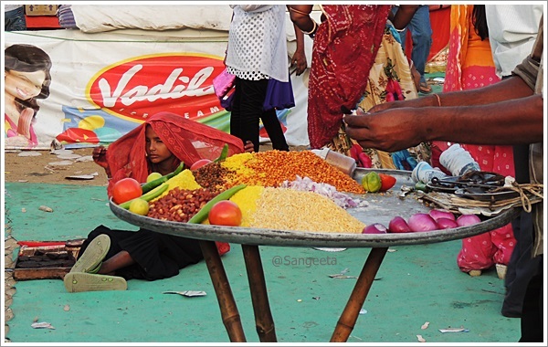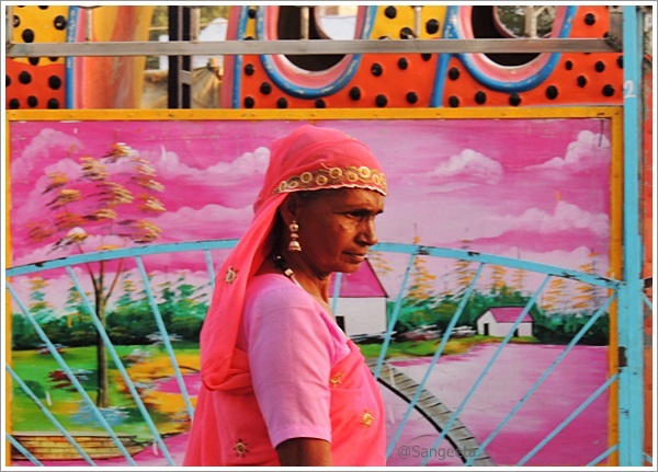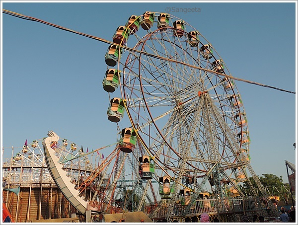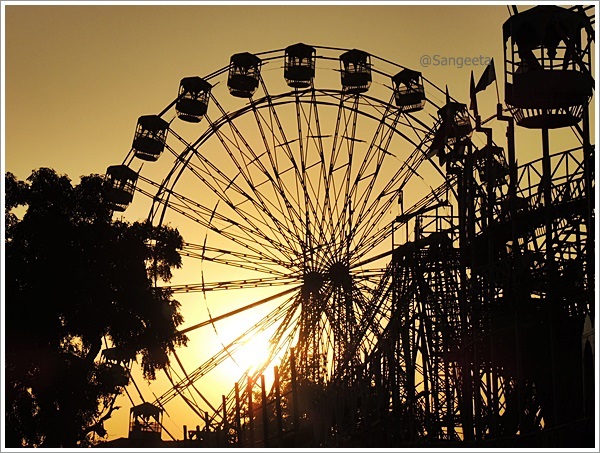 As the afternoon sun slowly slipped away behind the giant wheels, I went about sampling street fare. The hot, sweet and sour taste was enhanced by the dust sprinkled by the mellow wind. I stood in a corner to see the world go by, the little boys and girls, women adorned with trinkets, sounds of bangle sellers and the odd ascetic walking around with a sense of calm unfolded the different colours of India.