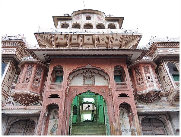 We climbed a few steps through the decorated arch and gateway into the main temple complex. The blue walls and the red arch of the temple is pretty distinctive and a small stairway leads to some underground passage with a Shiva Temple. The black stone 3 headed statue of Brahma accompanied by Gayatri is in a kind a blessing mode.