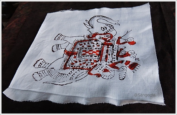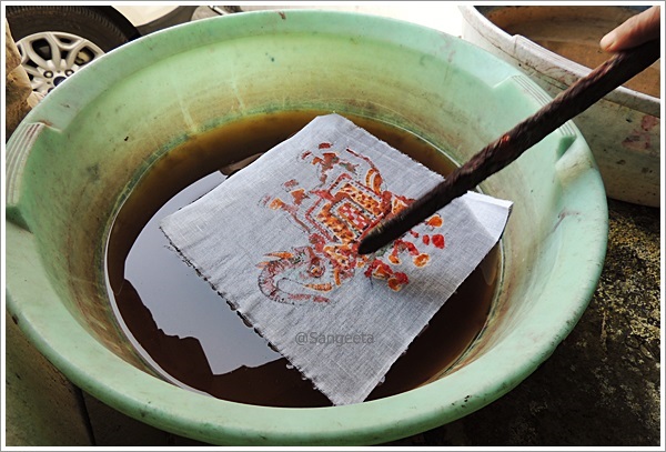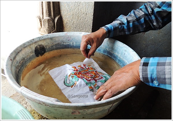 The freshly printed piece was then soaked in a small tub of water which had a tinge of chemical which converted the reddish colour to green. Then it was dried out in the sun !! I also learnt how to distinguish between machine printing and hand block printing.