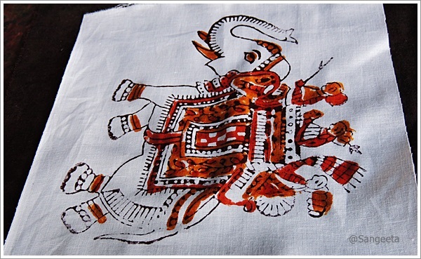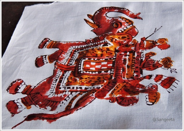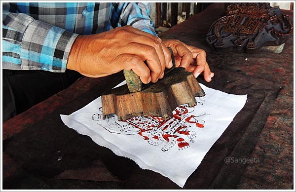 The number of blocks required for one print depends on the number of colours to be used, each block design corresponding to a colour to be used. The printing is done outside in ie first the outline and then the coloured ones. The colours used are natural dyes, made from plants, spices, ground stones etc. Typically, yellow is obtained from turmeric; red from beetroot, blue from indigo, cream from fullers earth, green from a mixture of indigo and pomegranate. He printed the elephant design that we had earlier seen inside out, dipping the blocks in the required colour and pressing it hard on the cloth. It is usually done from right to left when a long piece of cloth needs to be printed.