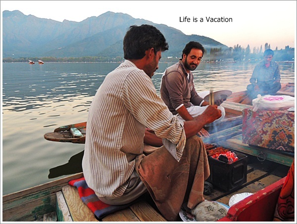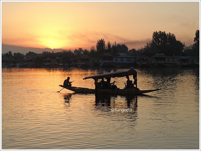 Dal in Evening – It is a happy carnival on the Dal in the evening, with colourful Shikaras floating around with romantic couples, happy families and dreamy youth. All I wanted was to just be in that moment. The pretty ladies sharing a laugh while they rowed their boat was heart warming, reminding me of my younger days. While we waited for sunset, another Shikara pulled up with some mouthwatering kababs that could hardly be resisted. On the other side, Shankaracharya Temple atop the hill could be seen through the trees which we had visited during the day.