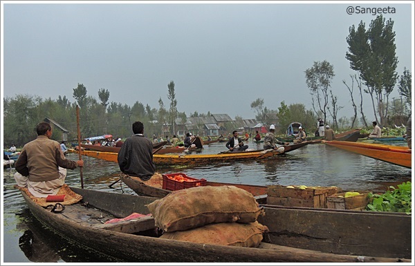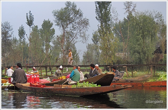 Dal at Sunrise : Mornings are often misty and hazy yet this is the time (6am) to capture the birds and visit the Floating Flower and Vegetable Market to experience the brisk business that takes place from one Shikara to another. It was a cold morning and the droplets of ice on the lotus leaves looked like translucent pearls. In all my excitement in the market, I purchased some green apples that I curried back home with the special Kashmiri spice. Some were trying to sell Saffron, dry fruits, trinkets etc but it is better purchased from the shops in Lal Chowk (market). While returning, We stopped by at Char Chinar (island with 4 trees) which has seen the history of the land evolve over the years.