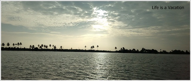 Soon there was a splash of red in the middle of green and blue waters. The local team attired in red T shirts were getting ready for the annual boat race to be held on 8th August 2015 (2nd Saturday of August every year). Watching them row in unison as they screamed out for power brought a smile to my lips in praise of their team spirit. The ferry had turned around for Alleppey and the golden glow across the distant green soon changed colors to make way for the moon.