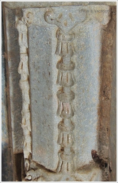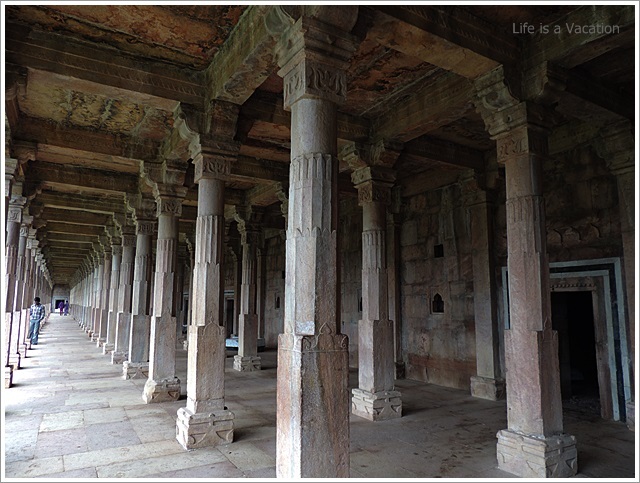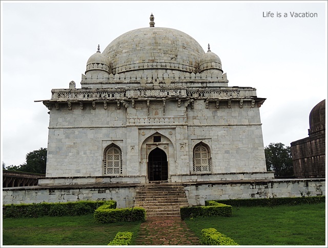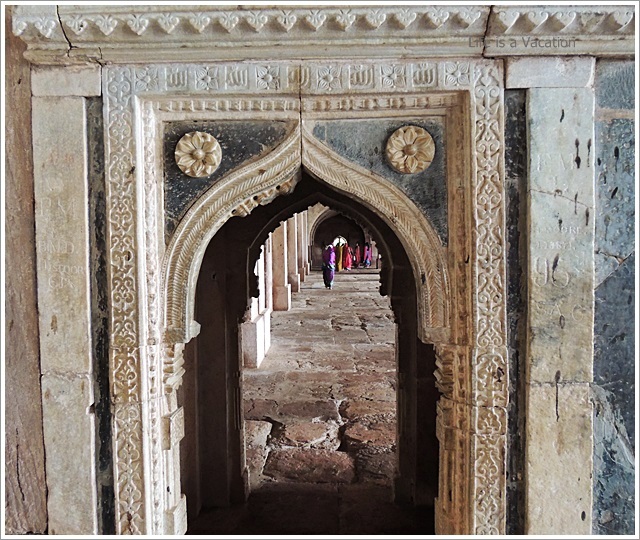 Hoshang Shah’s tomb is located right behind the mosque and can be easily accessed from the back exit of Jami Masjid. This was the first marble structure built in India and it so impressed Shah Jahan that Mughal Emperor Shah Jahan sent his team to inspect and replicate ideas in Taj Mahal. The interior and exterior is pretty simple apart from the rimmed line of blue enamel work. The latticed windows inside are a reminder of the Gujarat style seen in Sidi Sayyed Mosque in Ahmedabad. The other graves alongside his seem to be that of his children. The The pillared hall along side the tomb is a combination of Hindu (flat ceiling with pillars and brackets) and Islamic (vaulted ceiling) influence.