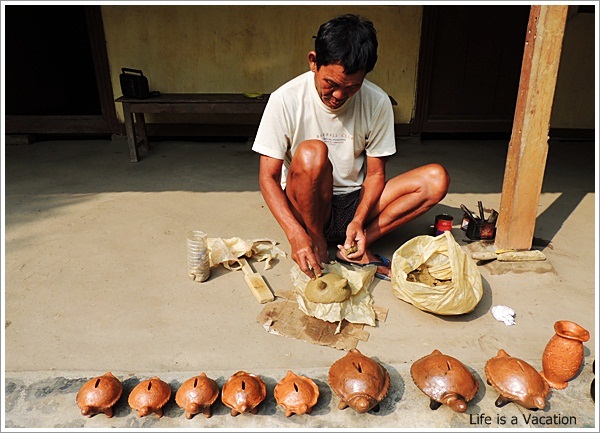 Andro is famous for hand made pottery. Just as we entered the village, an artisan was busy giving shape to a piggy bank. I watched his hands mould it into shape slowly and steadily. The artisans of Andro make amazing pots by hand which can easily pass off as made on the wheel to the untrained eye. We stopped by at the Mutua Museum which has placed Andro on the travelers map. This museum in Andro was started as a private initiative of Mutua Bahadur who is a noted museum curator, author and researcher. It is an open complex with different models of houses representing the Meiteis as well as the different tribes Tangkhul, Kuki, Kabui, Kom etc.