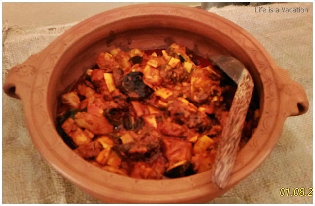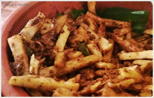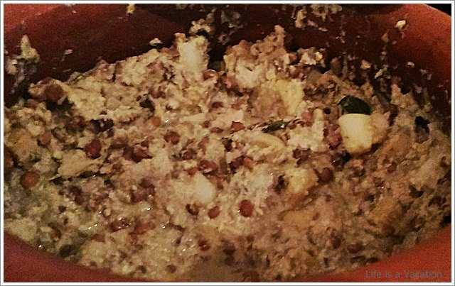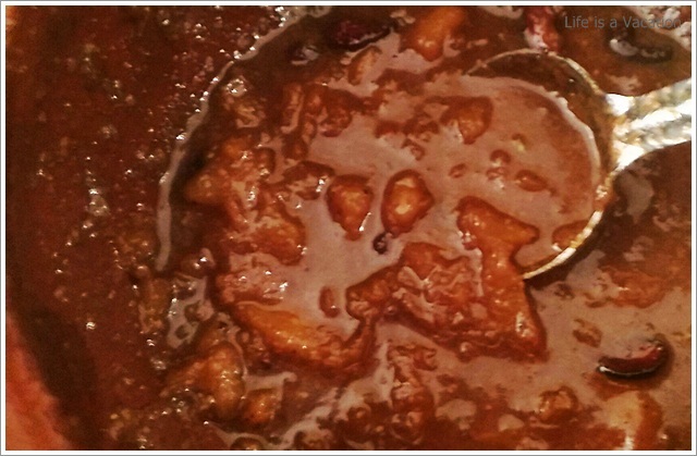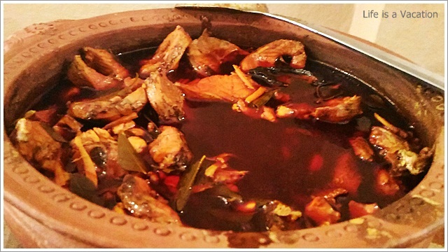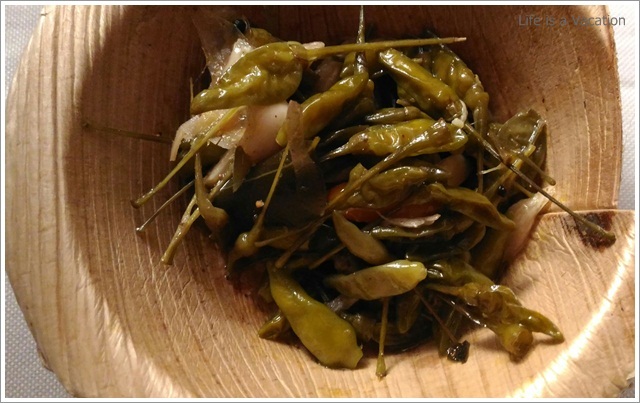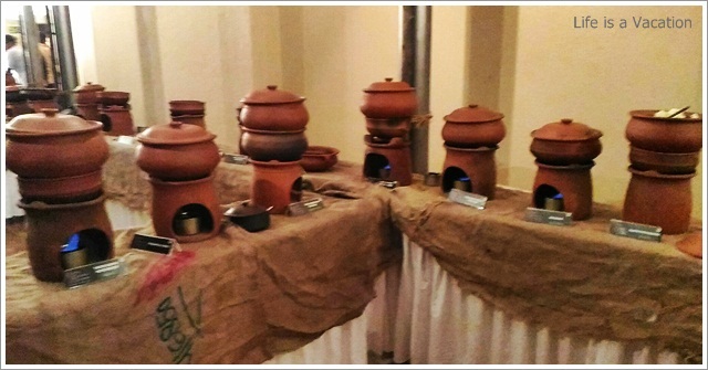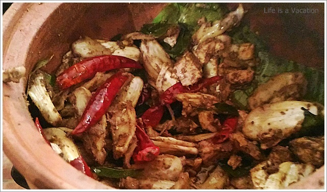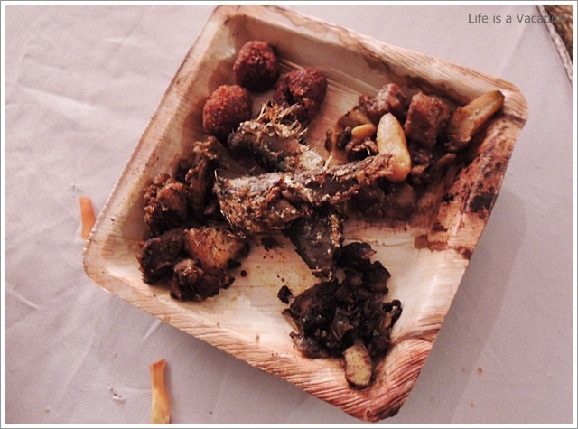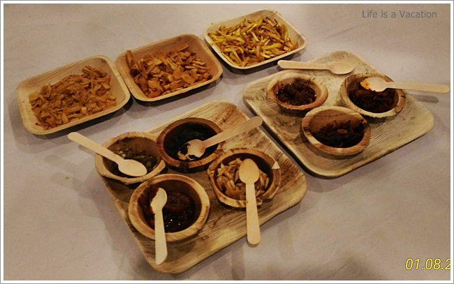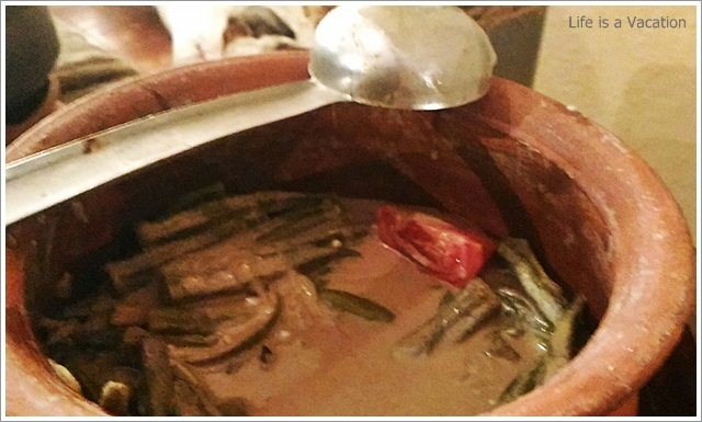 It was a huge spread complete with starters, curries and desserts sans any kind of carbs – rice, parotha or appam !! Sometimes the accompanying bread and rice items just kill the appetite in its zest to fill the stomach. All the dishes were laid out in earthern ware and the tables had trays of chips and pickles. I gorged on the jack fruit chips which were crisp and golden and did not have that familiar stench of stale coconut oil like the one from the neighborhood store. The accompanying fruit pickle and the garlic/chilly fry just made it all the more tasty. Had to remind myself a couple of times to control.