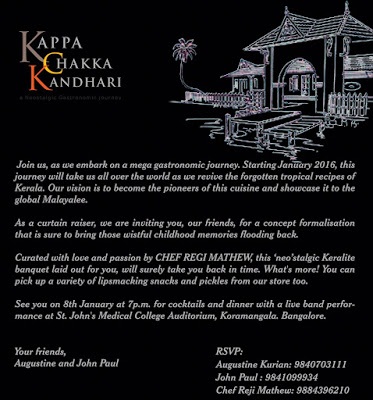 Kappa Chakka Kandhari !! The names of 3 special vegetables ( Tapioca, Jackfruit, Chilly) that every Malayalee is nostalgic about, the smells and the tastes that grand mothers dished out from their kitchens cooking on country clay ovens, carefully prepared in earthen pots. The taste of fish from the river and tapioca from the garden mixed with earthy love would make many an afternoon special while lazing under the trees in a country made hammock!! With changing times, very few are lucky to enjoy such pure unadulterated moments. With the globalization of the Kerala cuisine coupled with fusion recipes across the world most people outside the region identify it with Appam, Stew, Avial and some fish curry with coconut milk, Biryani, whole set of payasams made with anything that can be remotely cooked in milk or coconut milk and a variety of chips.