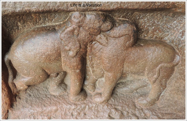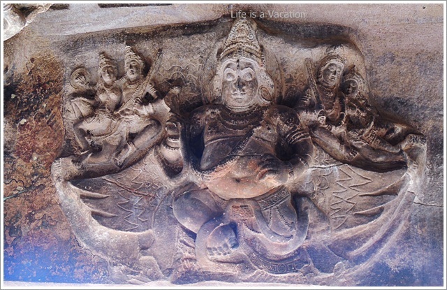 The other 3 famous sculptures in this cave are that of Mahishasur Mardini, Harihara and Ardha Narishwar. Ardha Narishwara is a combination of Shiva (left) and Parvati (right) along with Nandi and Bhringi. It is symbolic of the Yin and the Yang within us ; the male and female energy that exists within us in the form of Ida (female) and Pingala (male). Badami Caves-Cave1The sculpture of Harihara or ShivaNarayana is a single idol comprising Shiva and Vishnu is a masterpiece with its attention to detail of the depiction of 2 gods. Shiva is on the left with Parvati and Nandi by his side and Vishnu is on the right with Garuda and Lakshmi by his side.While Shiva is shown with the snake on his head; Vishnu has the conch in his hand, complete with jewellery !! While Shiva is the destructive force; Vishnu is that of sustenance. Badami Caves-Cave1-SculptureThe one that caught my eye was the Gaja Vrushabha which appears to be a combination of Elephant and Bull with one face. All the pillars are exquisitely carved with the trademark Chalukya Beads.
