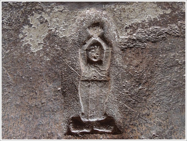 There are no idols in the sanctorum and in fact it is pretty dark inside. The ceilings have elaborate sculptures of chakras and intersecting connected Swastikas – the sacred Hindu symbol. There are two sculptures which caught my attention. Bhudevi (Mother Earth) being held on a lotus by Vishnu in Varaha Avtar. Apparently, she was kidnapped and taken to hell and he intervened to release her. Varaha is the symbol of Chalukyas and they have left their impression on every structure that was built at that time with the Varaha Symbol. Badami Caves-Cave2-Vishnu-VarahaThe other wall mural is  is that of Trivikrama related to Vamana Avatar of Vishnu which is more like a narrative. Lord Vishnu in Vamana avatar visited the demon god Mahabali and requested for 3 pieces of land. He readily agreed though his guru Shukra warned him since he had recognized Lord Vishnu in disguise. Lord Vishnu emerged into gigantic proportions as Trivikrama and placed one leg towards the sky (heaven); one on earth and Mahabali offered his head for the third.Badami Caves-Cave2-Vishnu