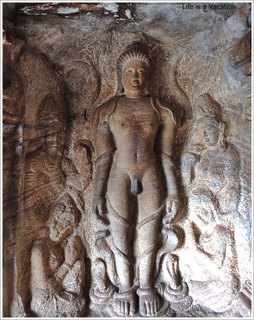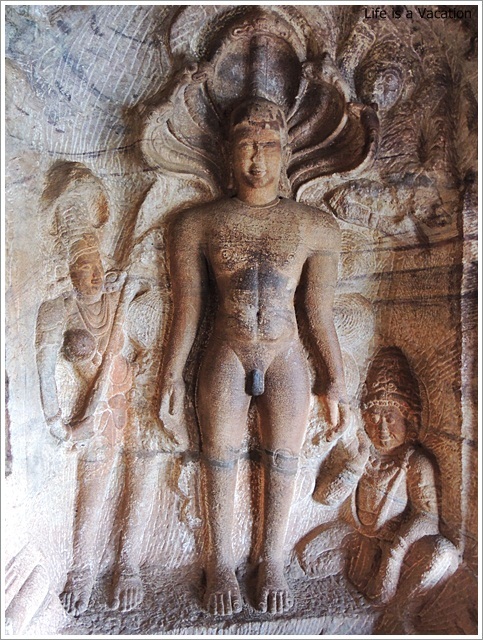 This cave has elaborated carvings of Paswanath (23rd) and Mahaveer (24th) Jain Tirthankara all in Digambara Jain style. The notable ones are Parswanath in meditation with Adisesha the 5 hooded serpent watching over him. The other one is that of Mahaveera meditating in Padmasana style. There is one of Bahubali through his body the serpents are coming out and his sister Bhahmi and other beautiful ladies are at his feet. You get a fantastic aerial view of Bhoothnath Temple from this point.