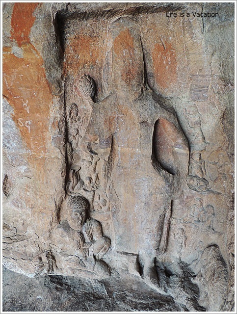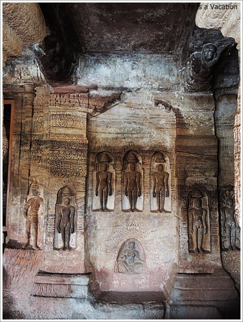 The walls of a fort can be seen on top of the caves which was built much later. The place is very crowded with locals, tourists, school children jostling for space. It is better to go in with a guide who will explain the carvings. There are a few accredited ones from Karnataka Tourism and better to avail their services.