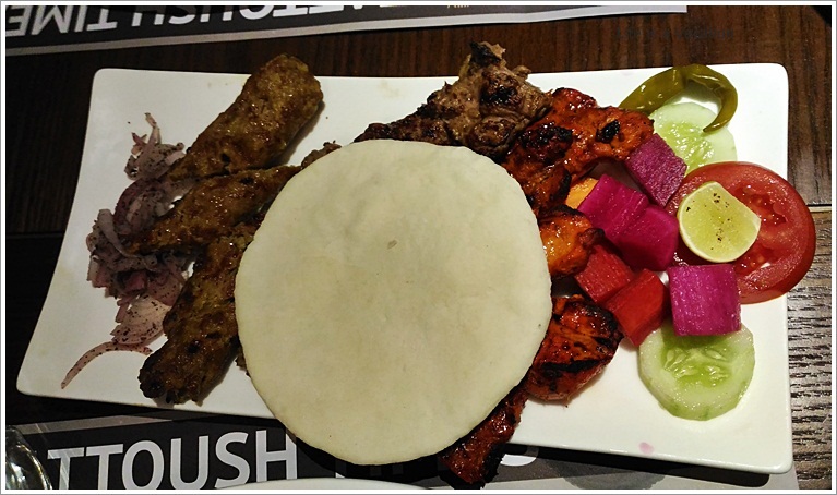 Sheesh Tawook, Mutton Yoghurt, Mini Mix Grill, Mandi Mutton & Kabsa Dejaj. The Sheesh Tawook (Chicken) and Mutton Yoghurt starters were presented in a very unique way with the skewers hanging from a metal ring. These were accompanied by bowls of hummus though I was secretly expecting the garlicky tahini sauce. Sheesh (skewers) chicken(tawook) was very tender and well cooked and the spices seem to have rubbed in well. The mutton could have been tenderized a little more but the smoky flavour made of for it. The Mini Mix Grill was grilled mutton and chicken served with Pita Bread and some diced lemony salad. Had a small portion rolled into the Pita with some salad and it was something like a Doner Kebab.