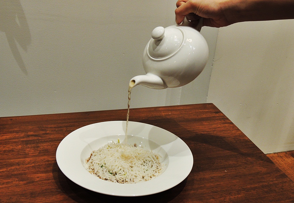 The Risotto was infused with Parmesan, Cheddar and Gryuere cheese and the Burmese Tea Salad was lettuce with roasted nuts and dal generously doused with fermented green tea. As conversation flowed, cups of different varieties of tea and Pita Bread with Green Tea infused Hummus, Marbled Egg Salad and Grilled Sandwiches followed. While everyone gorged on the hot crunchy pakodas sipping into Kullad Chai desi style, I went back to the bowl of fried rice steeped in tea. There was something about the flavour and texture of rice that hooked me on. It was a perfect blend of tastes.