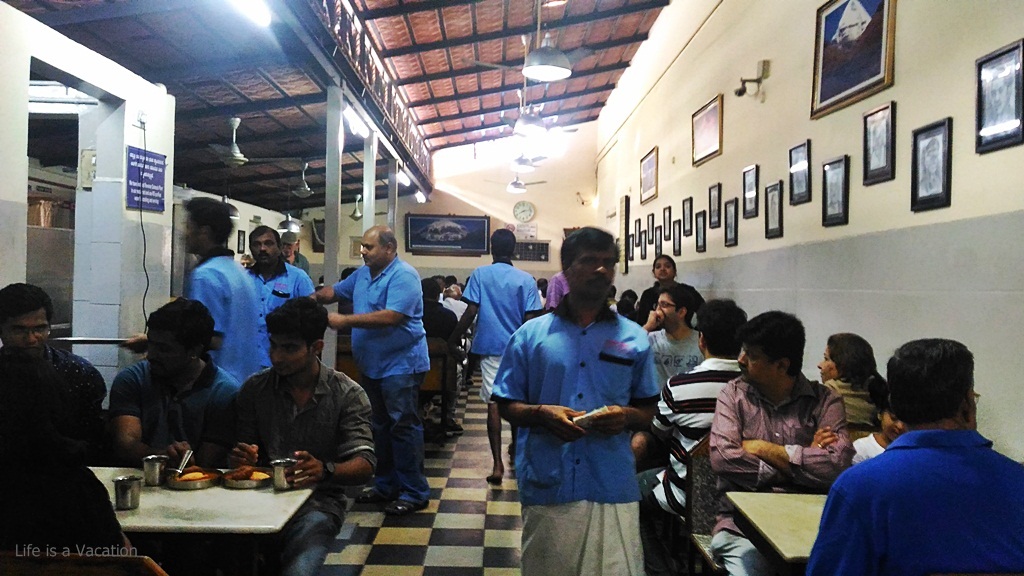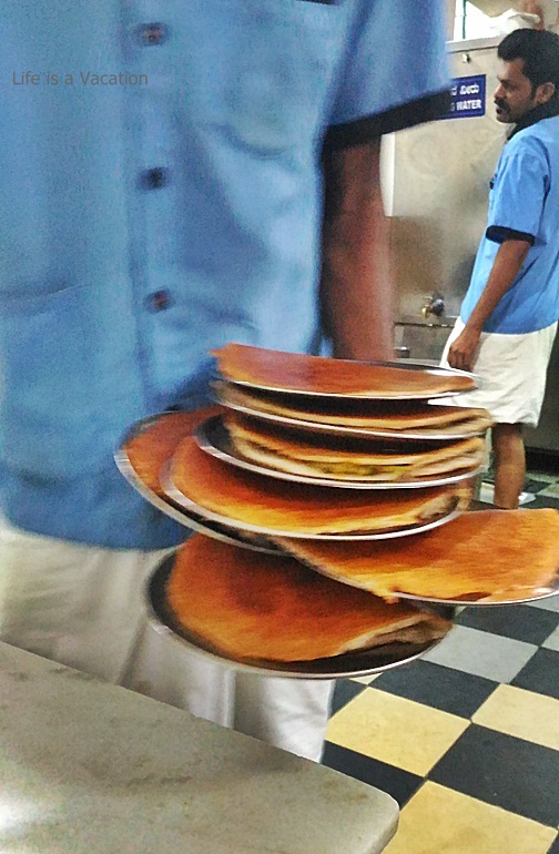While waiting for my Benne Dosa ( Dosa with oodles of butter), I observed the machine like service by the staff often holding dozens of plates of dosa precariously stacked on each other yet carried around with amazing precision. The dosa was crisp, oozing butter and melted in the mouth. Used to thick chutneys, the thin consistency of the chutney was a welcome break.