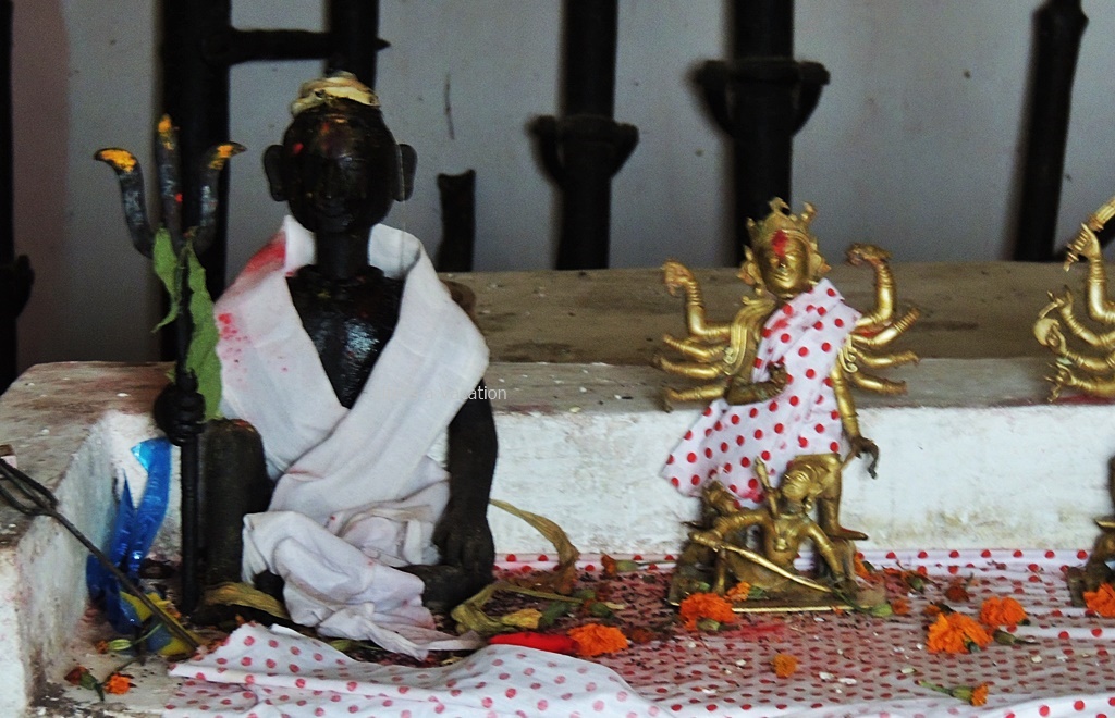 I followed little Panditayan (little priestess) to the Shiva Temple close by since I was in no hurry. A very handsome Lord Shiva carved out of black stone was wrapped in white with his trident in hand and a 10 armed Brass Durga by his side. The armory of shooting equipment stacked neatly behind caught my attention and am sure these are dated by a couple of centuries.