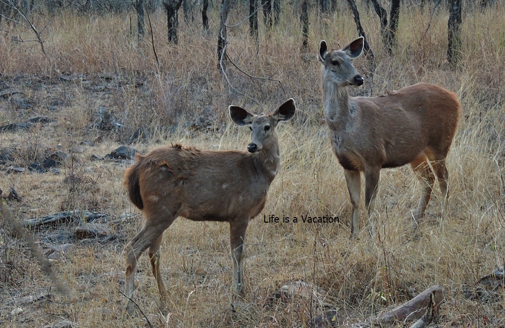 Our naturalist guide joined us from the Park Gates for an additional charge of Rs 350/-. As I have noticed in other National Parks in Madhya Pradesh, these naturalists are mostly experienced locals who have been trained and included in this profession to keep them gainfully employed. He knew the park inside out and guided us through the park to the best spots for sighting animals. After inquiries with the guards in the watch towers we did take a couple of turns within the park in search of the stripey but all we saw was fresh pug marks. The tiger / tigress remained elusive after a 3 hour sojourn. I was very happy to see the spotted deer, sambhar, bara shinghi deer, bear, monkeys jumping across trees, birds, nilgais and butterflies.