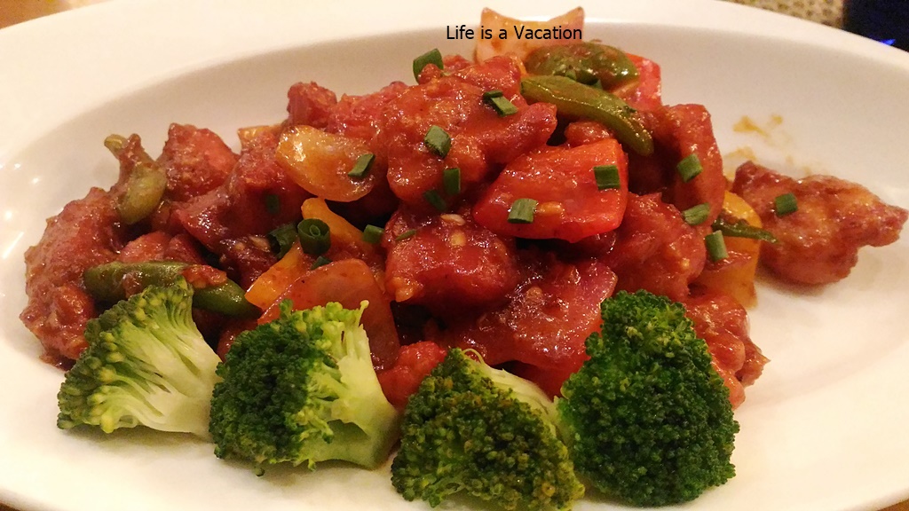 The Shumai and Corn Dumpling were perfect in their own way but Veg Cheung Fun turned out to be the star of the evening. Lightly fried and toasted vegetables were tightly rolled into broad but wafer thin rice noodle sheets in Veg Cheun Fun. The rolls were cut into 3 pieces for ease of eating and sprayed with soy and oyster sauce. One bite into these delicate delicious pieces and a burst of flavors in the mouth bowled over a hard core chicken eater into a veggie fan. Its a different matter that the dish originating in Hong Kong owes its name to Pig Intestine (Cheung Fun) given its appearance 🙂