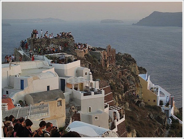 Down below there were boats on the sea that were drifting towards the setting sun and it appeared to be a ride to heaven. The sun set boat rides can be booked in advance and though expensive it is a rather peaceful and contemplative way to watch the sun merge into the sea. The reflection of the sun on the calderas, and the sea lent a warm divine touch around which could be felt in the air. The blue domed white buildings of Oia were bathed in orange and yellow rays all set for a sundown party. It is extremely crowded during sun set and to get the best possible view you need to be there an hour or two earlier and park yourself in a suitable spot.