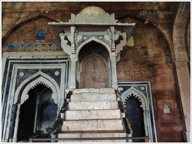 Jami Masjid is a 15th century structure which is said to be inspired by the Ommayad Mosque of Damascus. One look at the majestic red stone structure across the uber green lawn and it is apparent that it was conceived a a large expansive structure with a huge prayer hall. The arched hallways are simple and spartan except for the marble Chattri like structure which us carved exquisitely and has blue enameled work at the background “meenakari”. As you walk through the hallways and look closely at the pillars and arches, the Hindu influence is very apparent, the bells, the lotus, the flowers and temple dome.