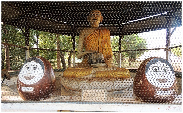 We climbed a watch tower to get a glimpse of Tamu town. The Buddha statues here were in Bhumisparsha Mudra where the fingers of the right hand touch the earth signifying the earth as the witness at the moment of his enlightenment. Everything around, seemed to have some strange connection with Hinduism; Buddha protected by a large Cobra similar to Shiva, the nine forms of Buddha arranged the way the Navagraha Planetary temples are in India. Just then a group of pretty young girls in colorful sarongs came by, kneeling down in prayer and quietly left before I could manage to strike a conversation.